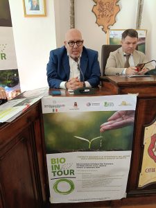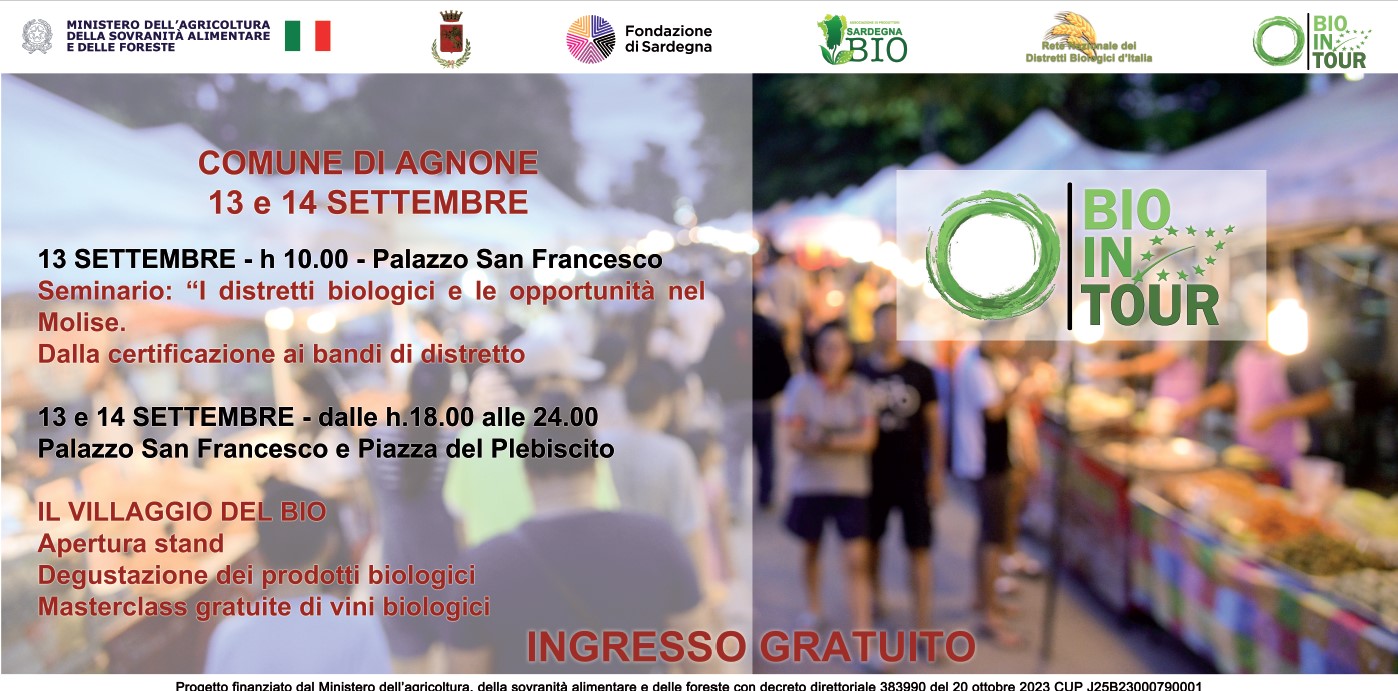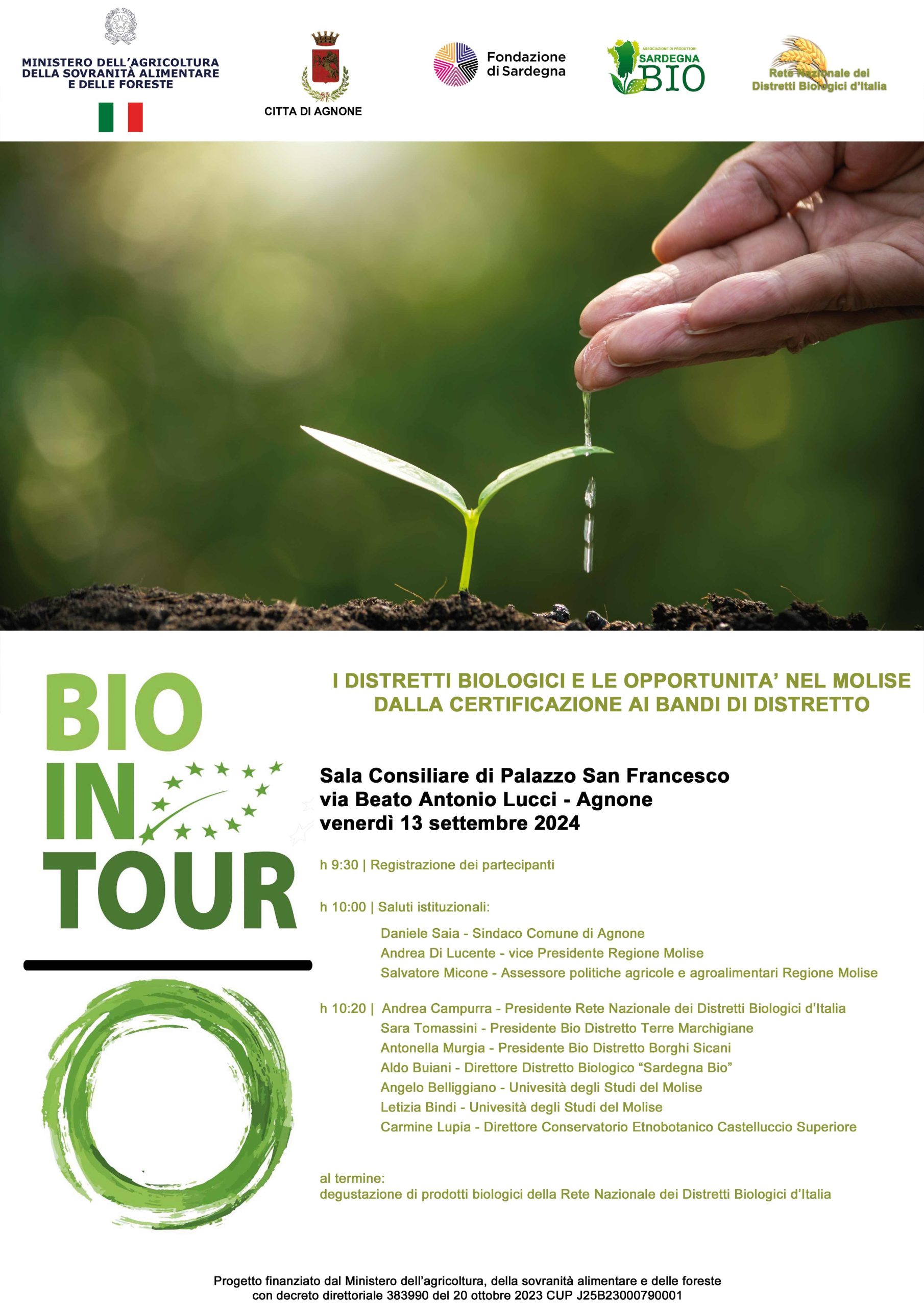 Bio in Tour, progetto di promozione del biologico in dieci regioni d’Italia, della durata di due giorni ciascuno durante i quali si terranno altrettanti incontri/seminari, tavoli consulenziali ed eventi di degustazione e promozione e si terrà nelle regioni: Sardegna, Calabria, Marche, Lazio, Abruzzo, Sicilia, Emilia Romagna, Piemonte, Molise e Toscana. Lo scopo dei seminari sarà quello di contribuire al potenziamento e all’innovazione dei sistemi locali attraverso interventi orientati ad offrire un apporto corretto allo sviluppo economico del territorio attraverso la formazione e informazione sul settore biologico e le sue opportunità partendo dall'adesione ai bio distretti territoriali. I temi varieranno appuntamento per appuntamento: si parlerà degli antichi mestieri e delle pratiche agronomiche, della professionalità degli operatori delle filiere BIO e delle opportunità economiche del Biologico. Si parlerà anche di formazione sulle tecniche di agricoltura BIO e del valore delle produzioni BIO. Eco-sostenibilità e agricoltura BIO in Italia con focus sull'organizzazione tra gli operatori della filiera. Particolare attenzione verrà data al marketing e allo sviluppo locale e alle azioni di promozione nei mercati europei ed esteri. Infine si esporranno le opportunità dei Contratti di filiera e le azioni di collaborazione tra istituzioni locali e produttori BIO per la programmazione dello sviluppo territoriale con i Bandi di Distretto. Protagonista sarà anche il tema dell’agricoltura sociale che, per quanto la struttura socio economica delle aziende partecipanti sia costituita prevalentemente da attività operanti nel settore primario, si punta ad una trasformazione significativa del rapporto frasoggetto svantaggiato e realtà sociale, trasformando quest’ultimi da elementi gravosi della società a risorse attive e forze trainanti per le realtà produttive del settore primario.